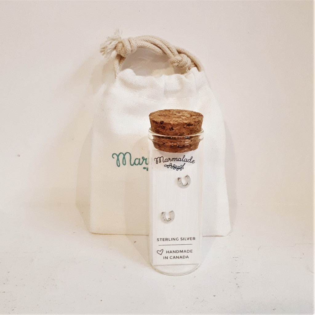 These bronze sculpted earrings with sterling silver posts, from the studio of Kate Singer in Toronto, Ontario, are the perfect subtle stud earrings. Catch and hold the luck in these tiny horseshoes. Each pair comes in this great little glass bottle with stopper and canvas bag - great for gift-giving.