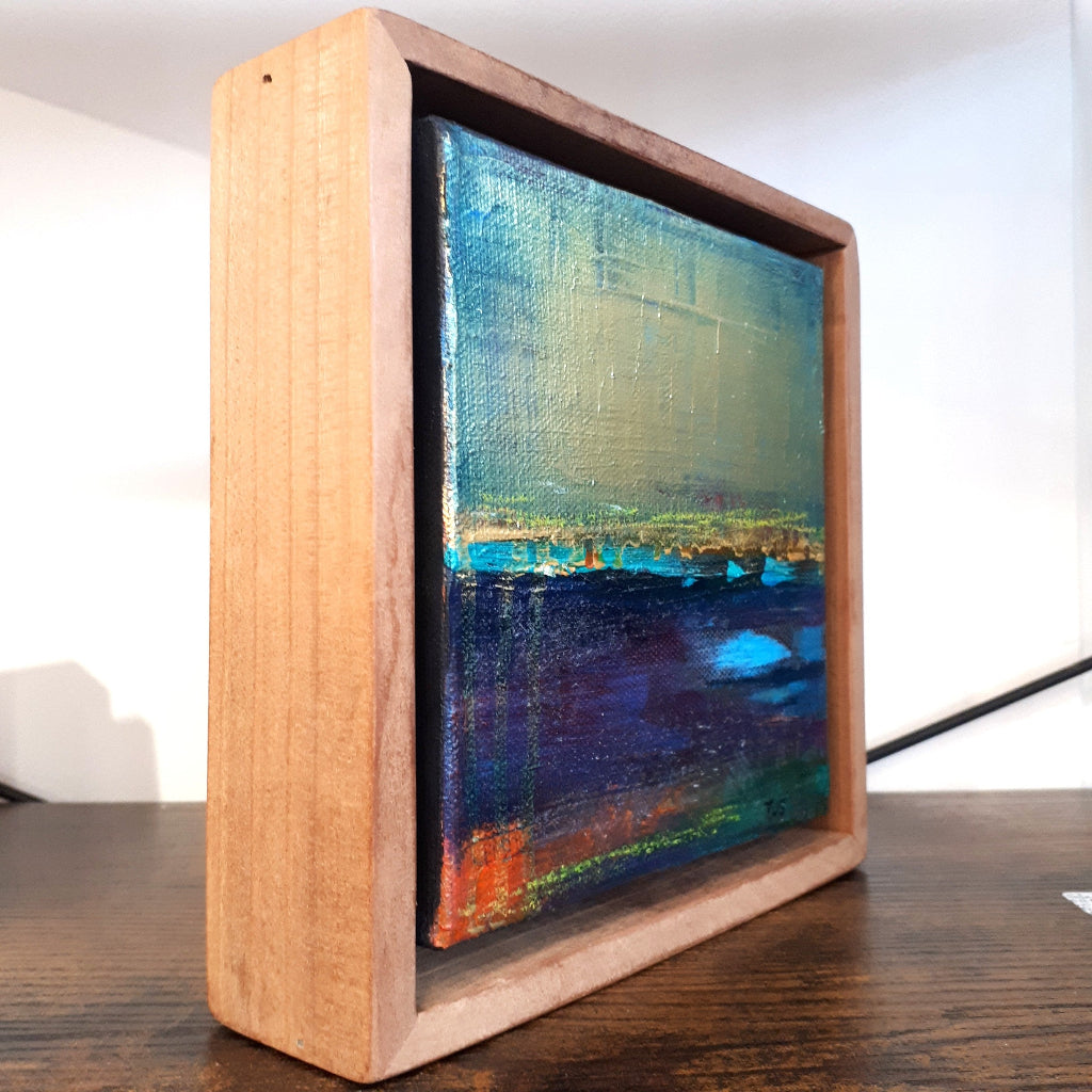 Size 6” x 6” Framed to 7 1/4” x 7 1/4” x 2”, in a beautiful float frame made by the artist. Oil & acrylic on canvas. Ready to hang, or style on a shelf.