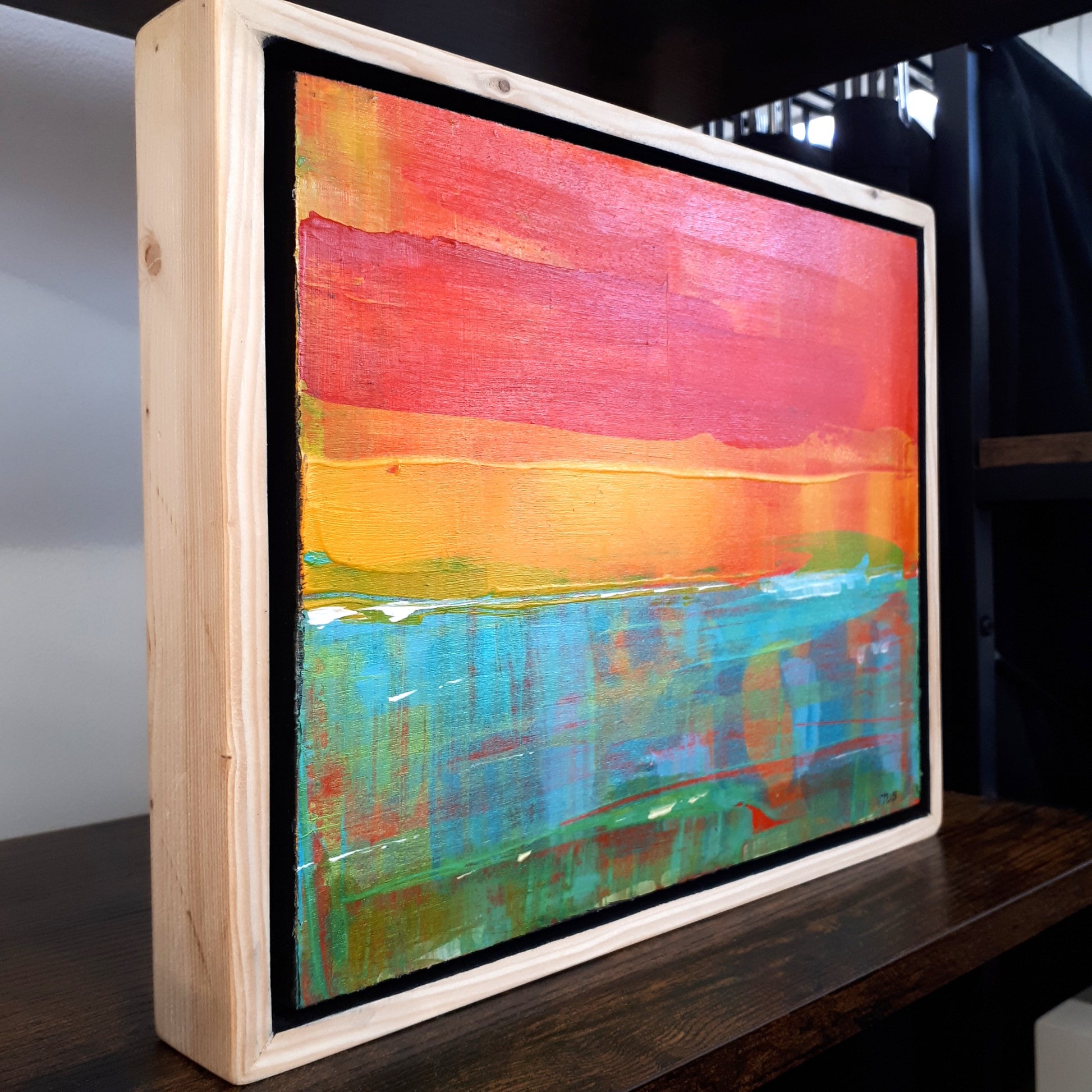 Size: Framed to 9” x 11” in a solid wood 1 1/2” deep float frame beautifully made by the artist. Oil & acrylic on panel.