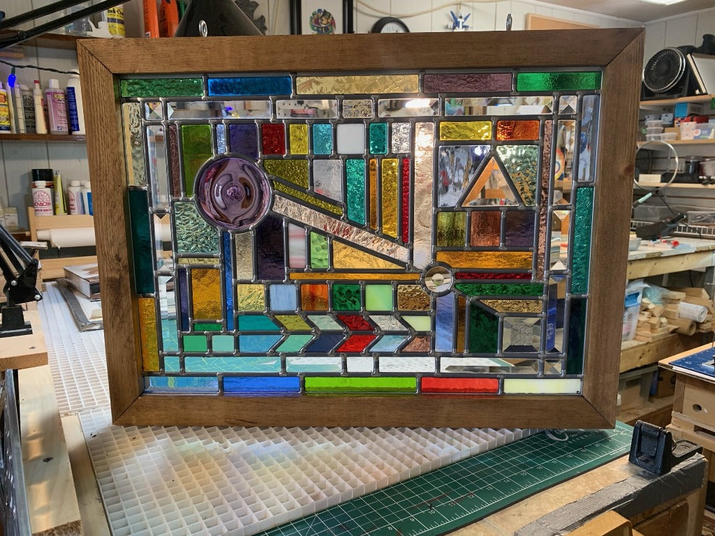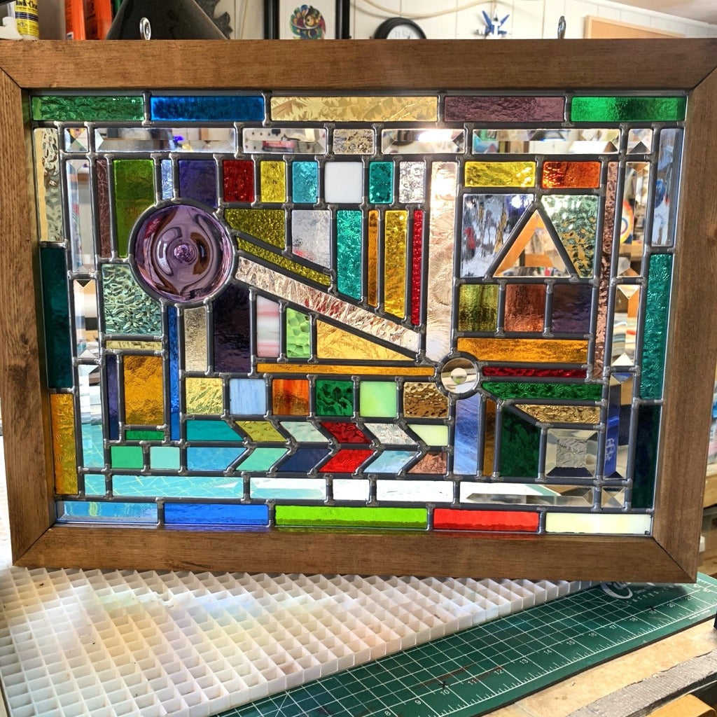 Another extraordinary work by this Canadian stained glass artist. So many shapes, colours and textures make up this piece that encapsulates the movement of the nostalgic pinball machine. Enjoy the skill evident in the design and execution of this fantastical piece.